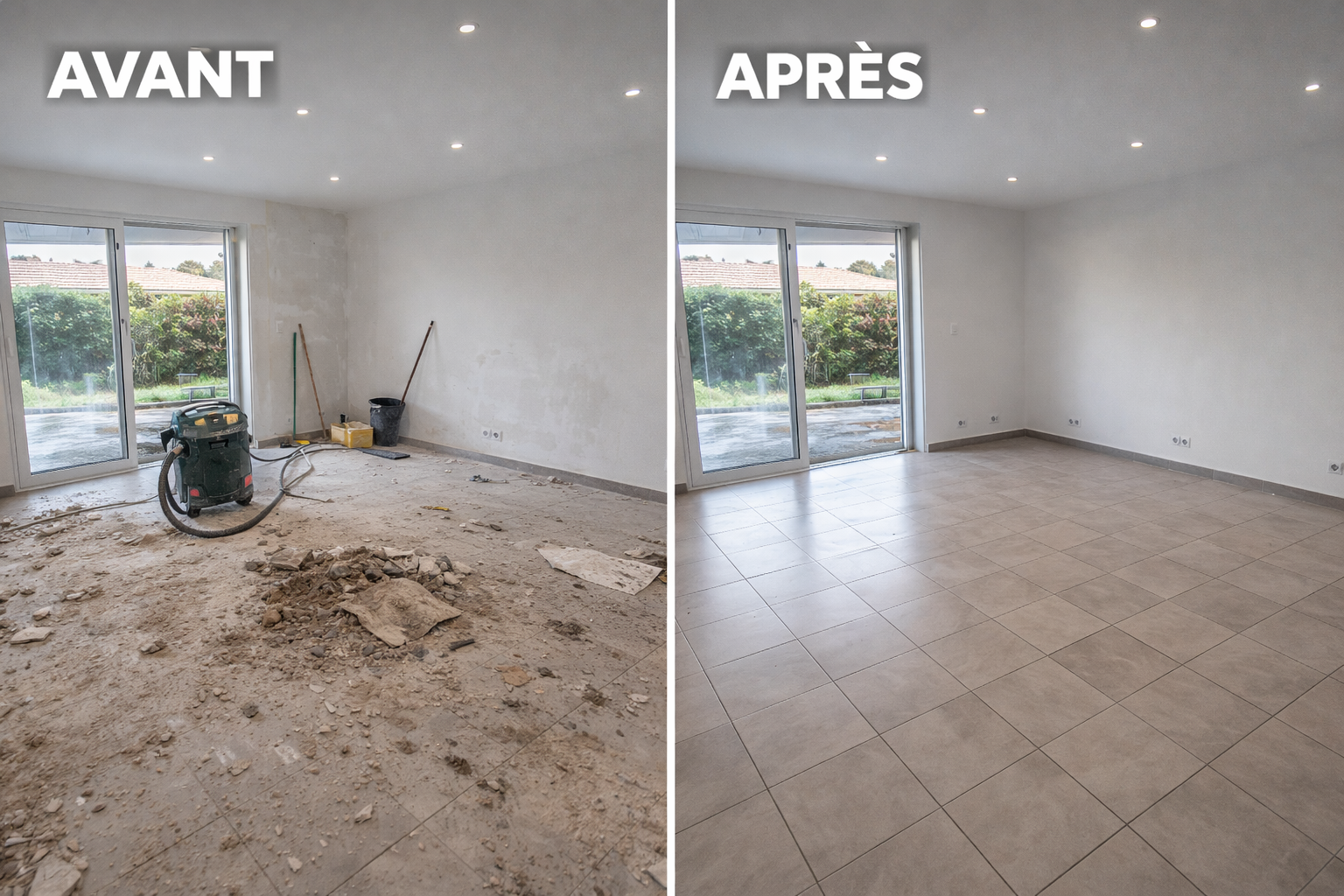 Élimination des résidus de chantier, poussières, gravats et autres salissures pour un espace entièrement remis à neuf.